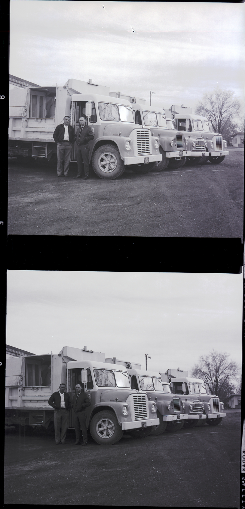 - Harry Knigge, sanitation company foreman, and Chad Thompson, city sanitation inspector, stand beside new garbage trucks owned by the Eldon Corporation. A house and a tree are seen in the background.