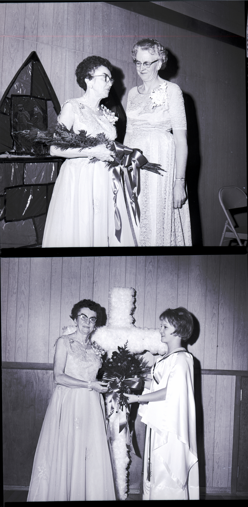 In the top image, Mrs. Margaret Harrell, grand guardian of Idaho, International Order of Job's Daughters, admires the beautiful bouquet of roses held by Mrs. Mary Etta Wright, supreme guardian. In the background behind them is a Biblical display. A folding chair sits in the corner. In the bottom image, Connie Van Ostran, honored queen of Bethel No. 43, hands Mrs. Mary Etta Wright the bouquet of roses. Behind them is a large white cross.