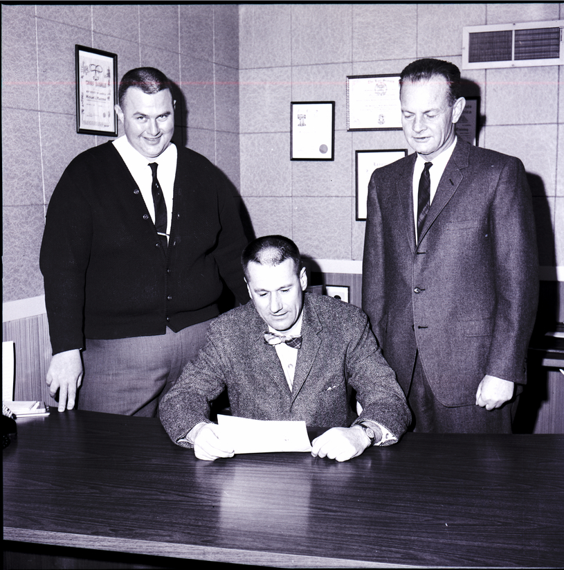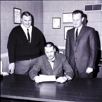 Reading a letter honoring the Snake River Area Council one of the top four Boy Scout councils in the nation for its outstanding program in camping are, from left to right, John Bertie, council vice president; Dr. Paul Heuston, council camping chairman; and Max Rees, member of the council's long-range committee on camping. Mr. Bertie is wearing slacks, a tie, and a sweater. Dr. Houston is wearing a suit and bow tie and is seated at a desk, holding the letter. Mr. Rees is wearing a suit and tie. Several framed certificates hang on the walls behind them.