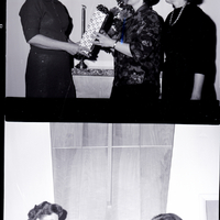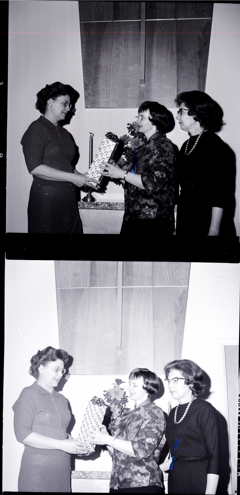 Presenting a gift to Mrs. Howard Ronk, center, is Mrs. Lloyd Johnson, left, YWCA board member, as Mrs. LaVern Routh, YWCA Board of Directors' president, looks on. They are dressed in blouses and skirts. On a stand behind them are some candles and a bouquet of flowers.