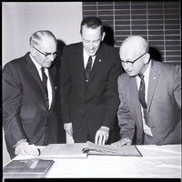 - Board of Directors officers for the YMCA look over a YMCA scrapbook. From left to right are John B. Sims, secretary, Gordon Cox, president, and Howard Burkhart, treasurer. They are dressed in suits and ties. On the desk is a plaque.