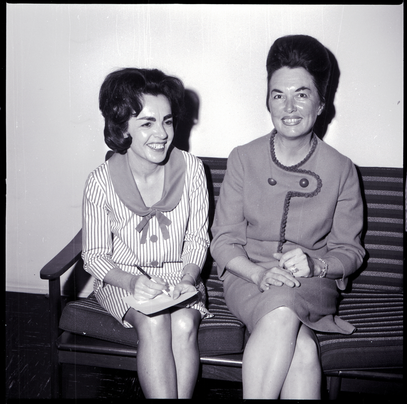 New officers of the Petticoat Pollys are, from left to right, Mrs. John Detweiler, vice president, and Mrs. Robert Stephan, president. They are both wearing dresses. They are seated on a couch, and Mrs. Detweiler holds a pen and paper in her hands.