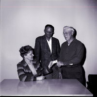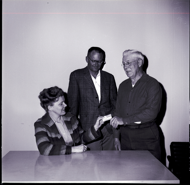 James S. Rude, Sawtooth National Forest employee, hands Louis Evans a gold recreation permit reading "1966 Federal Recreation Area Entrance Permit" after forest service permits go on sale in the Magic Valley. Robert Hoag, forest staff recreation officer, observes. Mrs. Evans is wearing a striped jacket. Mr. Hoag is wearing a plaid jacket, white shirt, and slacks. Mr. Rude is wearing a dark button-up shirt and slacks.