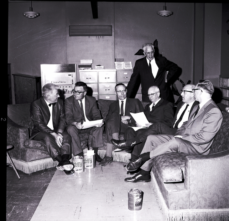 Others are, from left to right, Dorsey Riggs, Dean Charles Hegel, Dr. John Green, Dr. H. W. Steffens, Dr. Vail Foy and Dr. Elmer K. Raunlo. They are dressed in suits and ties. Some coffee cans holding papers are on the ground in front of them. In the background is a candy machine and some file cabinets.