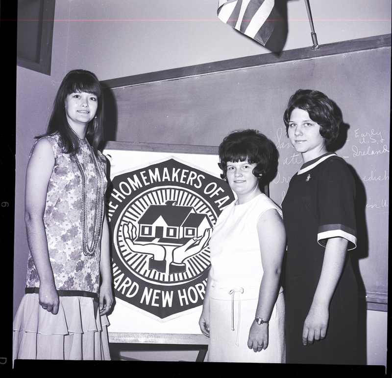 New FHA officers, from left to right, are Rhonda Miracle, president; Vicki Bickford, secretary; and Christine Newbry, treasurer. They are wearing dressing and standing in a classroom in front of a poster with the FHA logo that reads "Future Homemakers of America Toward New Horizons." Behind them is a blackboard, and an American flag hangs above it.