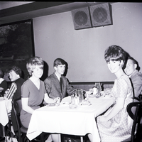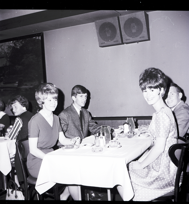 Enjoying refreshments during a social for Magic Valley Baseball Queen candidates held at Kay's Supper Club in Twin Falls are Pamela Jenkins and Rip Wilson, left, and Nancy Williams and Dave McCollum, right. The men are dressed in suits and ties and the women are wearing dresses, and they are seated around a dining table enjoying cake and tea. On the table are tea cups, saucers, condiments, candle holders, and ash trays. A large picture of a nature scene hangs on the back wall. Other diners are seen at the next table.