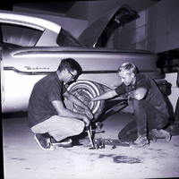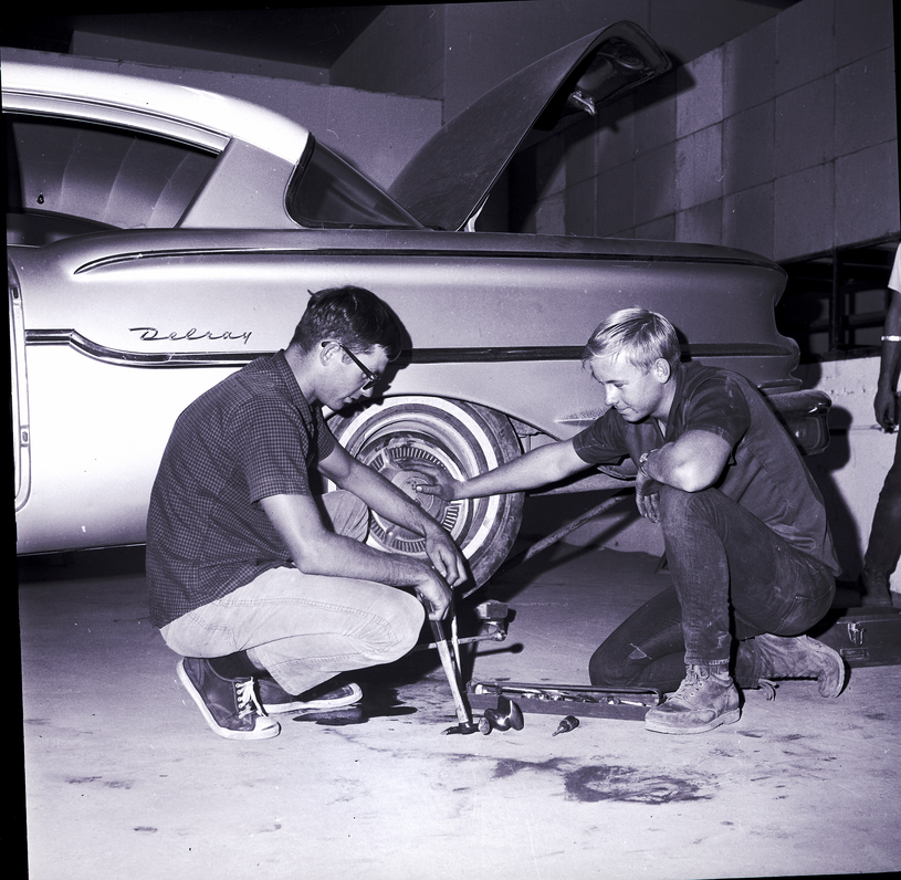 Adjusting a wheel on a Delray Chevrolet car in the auto body shop of the newly remodeled vocational school section of the College of Southern Idaho are Doug Karel, left, and Dell Wuebbenhorst. They are kneeling beside the back tire, and several tools are on the ground beside them. The trunk of the car is popped open, and another man watches from behind the car.