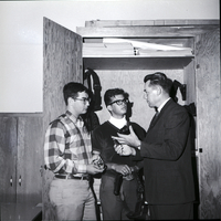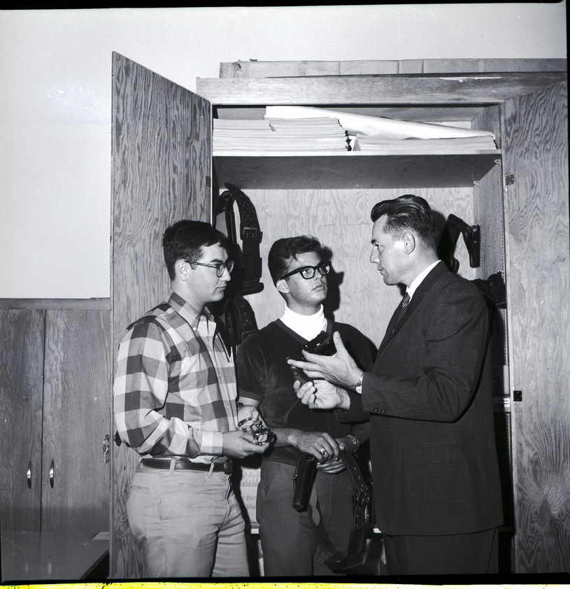 Wesley H. Dobbs, law enforcement instructor, right, gives advice to first year College of Southern Idaho vocational school students, James Mildon, left, and Ken Harkness, center, in the new classroom which is part of the modification done to enlarge the school. The students are holding handcuffs and an officer belt, and other officer belts and police equipment are hanging in a cabinet behind them. Mr. Dobbs is dressed in a suit and tie.