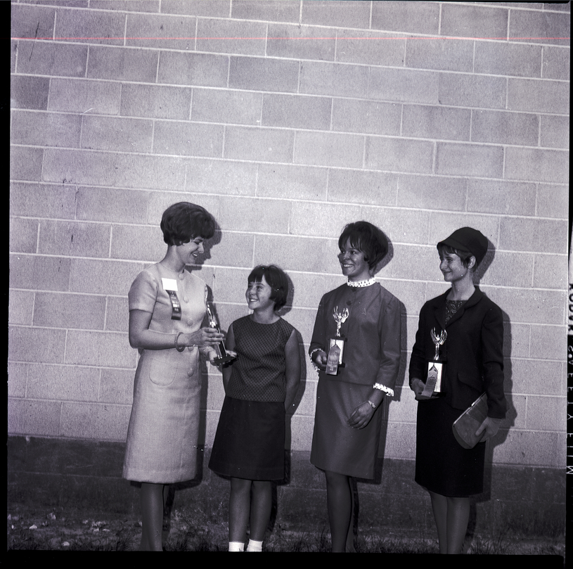 From left to right, Alice Reed, Twin Falls County home extension agent, awards 4-H trophies and award ribbons to Linda Hendrix, top model in the junior division; Linda Watson, second place model; and Linda Harder, top model, in the 4-H Style Revue. The style revue was part of the Twin Falls County Fair. Linda Watson and Linda Harder are wearing dress suits and Linda Hendrix is wearing a sleeveless blouse and skirt. Mrs. Reed is wearing a one-piece dress.