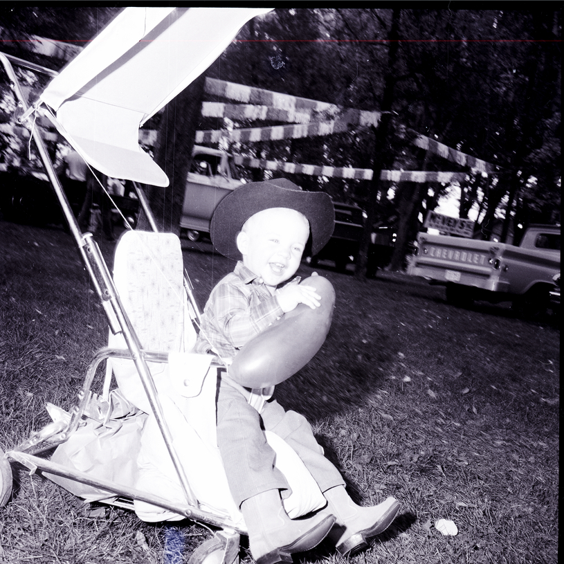 - A little boy in a cowboy hat and boots sits in a stroller holding a balloon at the Twin Falls County Fair. In the background is a showing of Chevrolet pick-up trucks.