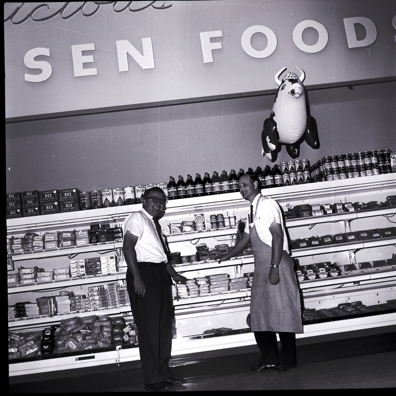 Two men stand in front of some refrigerated shelves of food at the Safeway grand opening. One of the men is wearing a long apron. An inflatable cow hangs from ceiling above them.