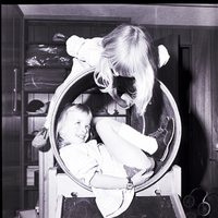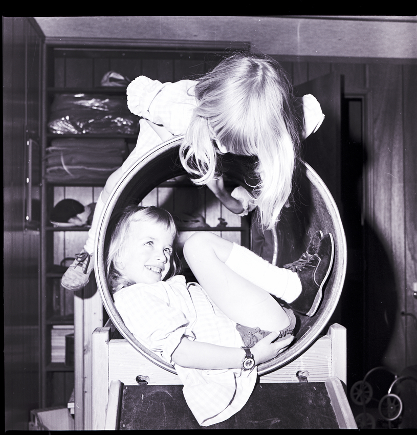Identical twins Lisa and Laura Hill play in a tunnel at Children's Village, a Montessorian method pre-school in Twin Falls run by Mrs. Charles Hopkins.