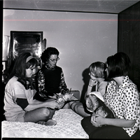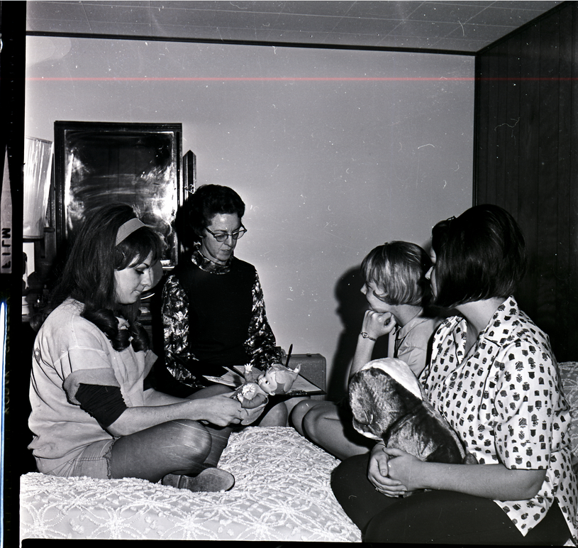 Dr. Adele Thompson sits on a chair beside a bed, looking over a clipboard of forms in her lap during a visit of female student housing. Three young women are seated on the bed, and one of the girls, Mary Tews, holds a doll while another girl holds a plush dog. A dresser with a mirror and a lamp on it are in the background of the room.