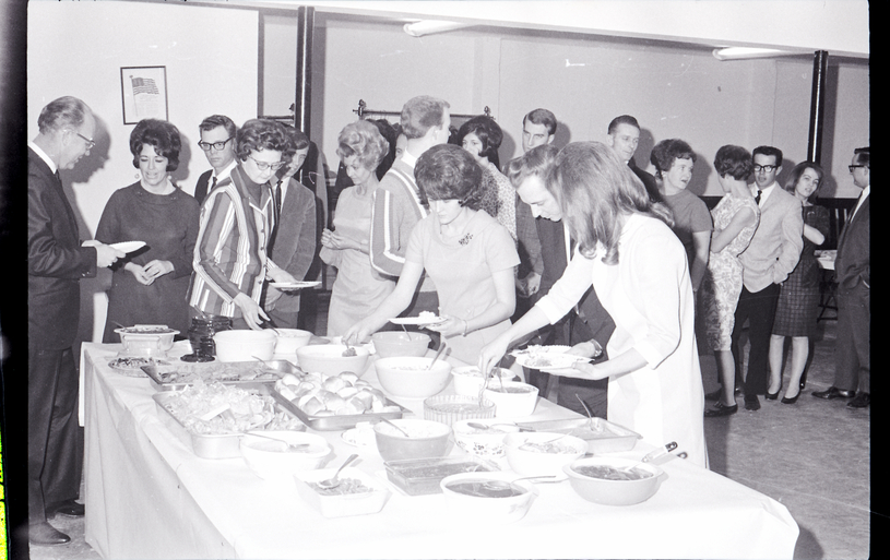 A large group of people stand in line for a potluck dinner at the Country Music Jamboree appreciation dinner held at the Twin Falls Moose Hall. On the table are an assortment of bowls of salads, a pan of meat, and a tray of dinner rolls. In the background behind the line of hungry people is a coat wrack and a picture of the American flag hanging on the back wall.