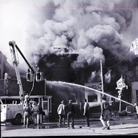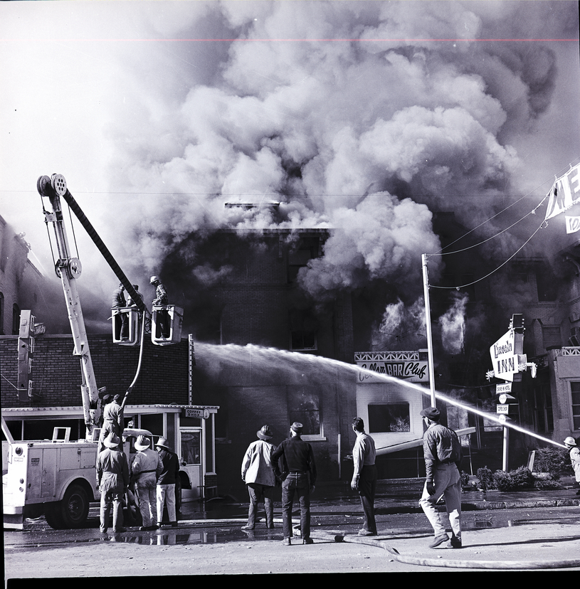Tongues of flame lick through windows and smoke billows up from the Lincoln Inn in Gooding as fire fighters pour streams of water onto the building, to keep the fire from spreading. The Cellar Bar Club and Gooding County Court House offices in the building were also destroyed in the fire. A fire truck is parked to the side of the scene and lowers three firefighters in a bucket to the ground after fighting the flames on the roof. Bystanders gather on the street, watching the fire.