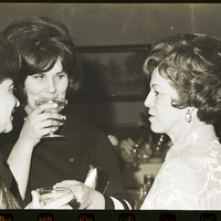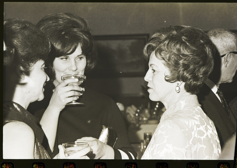 Two women chat with the first lady of Idaho, Mrs. Don Samuelson, right, during the Dilettante's "Sound of Music" opening night champagne dinner, held prior to the show at the Twin Falls Holiday Inn. The women are wearing dresses and holding glasses of champagne, and a man in a suit and tie stands behind them. In the background are several dining tables, and a painting hangs on the back wall.