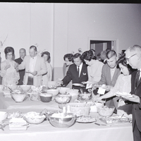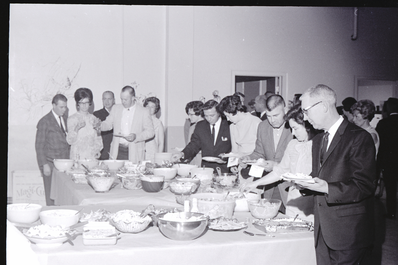 A group of people help themselves to a potluck dinner at a fundraising party held at the Buhl National Guard Armory and sponsored by Beta Sigma Phi. On the table is a tray of meat, bowls of salad, a vegetable platter, and a stack of paper plates. On the back wall are drawings of a mountain landscape and a soldier reading "On the Way!!"