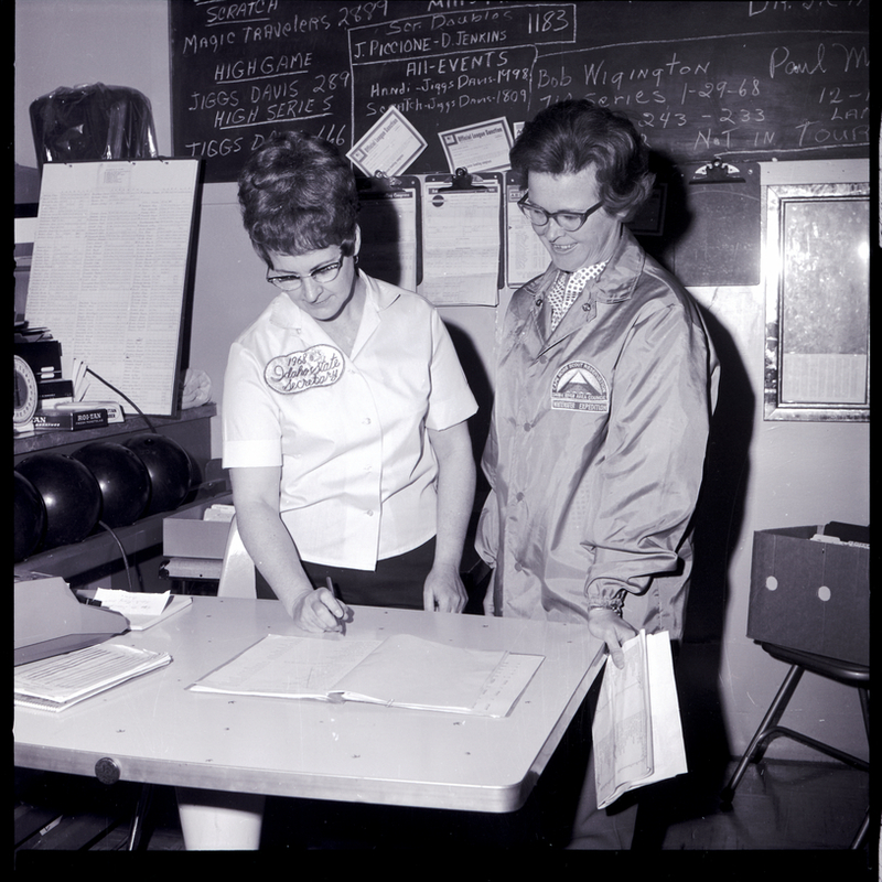 Two women stand behind a desk and take some notes at the Magic Bowl, where the 25th Idaho State Woman's Bowling Association Tournament was held. On the table are several notebooks and a typewriter. To the side of the desk is a shelf holding bowling balls. Several clipboards hang on the wall behind them. Above them is a large chalkboard with several different events and notes written on it. The woman on the left is wearing a shirt reading "1968 Idaho State Secretary" and the woman on the right is wearing a jacket with a patch on it reading "Cape Horn Scout Reservation Snake River Area Council Whitewater Expedition."