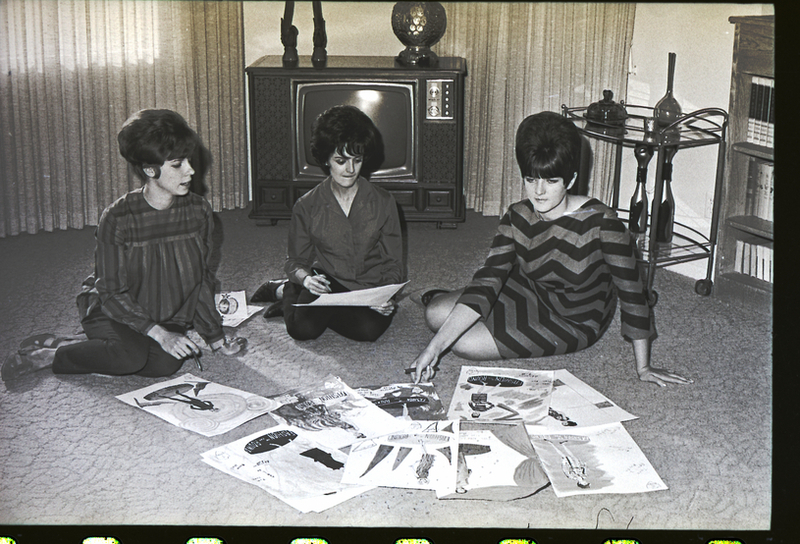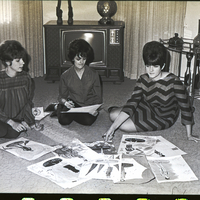 From left to right, Mrs. Larry Komlofske, Mrs. Doren Keith, and Mrs. Jim Steele sit on the floor in a living room and look over some fliers of clothing designs in preparation for the Jay-C-Ettes annual fashion show. The show will be held at the Twin Falls Moose Hall and feature fashions from the Idaho Department Store, The Paris, Roper Clothing Store, and the Peppertree. Behind them is a television with some decorative ornaments on top of it, and to the side of the room is a bookcase and a small glass table with decorations on it.