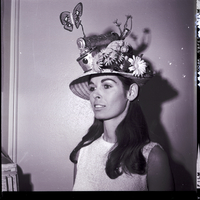 Carol Serpa wears a wide-brimmed hat covered in plastic flowers, a crown, a kaleidoscope, and a butterfly. The hat was homemade for Easter and worn during the Ladies of the Elks hat parade.