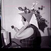 - Ola Cannon wears a hat shaped like an umbrella and decorated in plastic flowers. The hat was homemade for Easter and worn during the Ladies of the Elks hat parade.