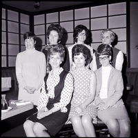 Officers for the Welcome Wagon Newcomers Club pose at a hat luncheon held at Kay's Supper Club. To the side of the group of seven women is a table with Welcome Wagon name cards and a bottle of soy sauce on it.