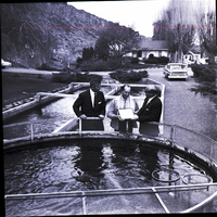 Robert Erkins, owner and operator of the Snake River Trout Company trout farm, is presented an Industrial Indemnity Company Safety Award by Dan Obenchain, right, and Don Elliot, left. In front of them is a trout hatching pond, and more ponds are located to the side. In the distance behind them is a house surrounded by trees and bushes, and a parked pick-up truck sits in a driveway. The walls of the Snake River Canyon surround the hatchery.