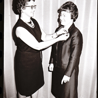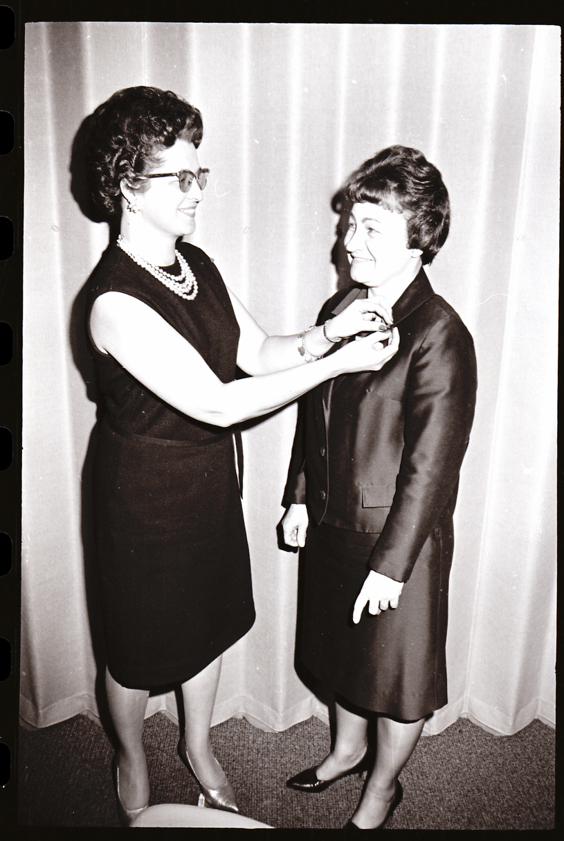Two winners of the Luther Hulsey Gulick award for outstanding leadership in the Twin Falls Camp Fire Girls Council, Mrs. Frank Depew, left, and Mrs. Orval Johnson, admire the pins presented to them at the council's annual dinner meeting at the Holiday Inn.