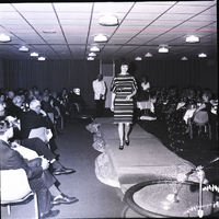 A woman models a striped dress at a fashion show during the Filer Kiwanis Club Ladies' Night held at the Twin Falls Holiday Inn. She walks down a runway with a fountain at the end. Several people sit in chairs at the side of the room, watching. At the back of the room is a table covered in a white tablecloth with a bouquet of flowers on top, and Mrs. Morris Carlson, the narrator of the event, stands behind it.