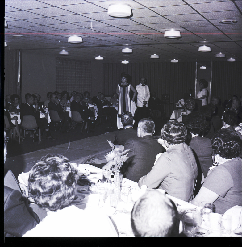 A woman models a striped dress at a fashion show during the Filer Kiwanis Club Ladies' Night held at the Twin Falls Holiday Inn. She walks down a runway with a fountain at the end. Several people sit in chairs at the side of the room, watching. At the back of the room is a table covered in a white tablecloth with a bouquet of flowers on top, and Mrs. Morris Carlson, the narrator of the event, stands behind it.
