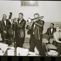 A band provides music at a fundraising party sponsored by Beta Sigma Phi and held at the Buhl National Guard Armory. The four men in the band, dressed in suits and bow ties, play the bass, trumpet, trombone, and drums. A woman dressed in an evening gown plays the piano. A microphone and sound equipment are set up around the musicians.