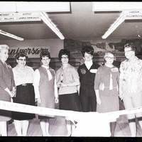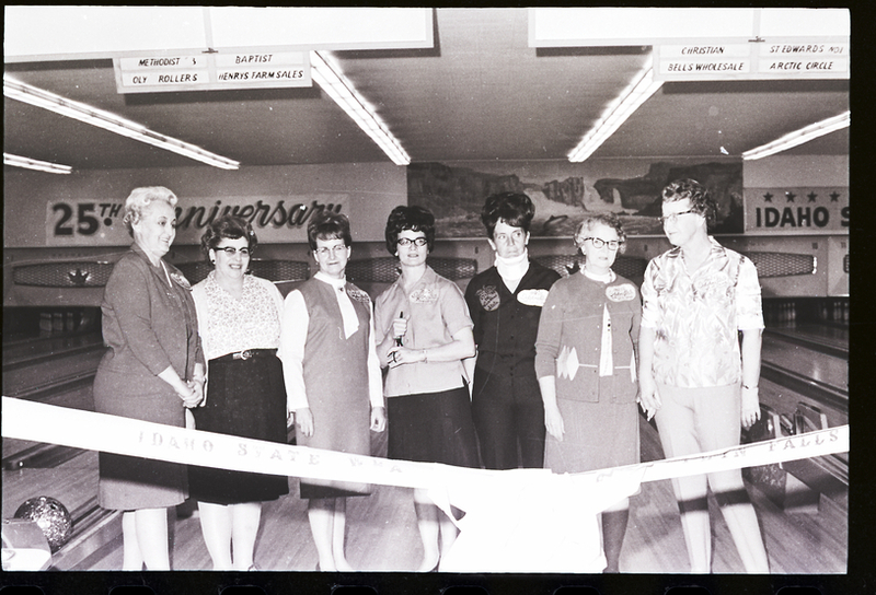 Among those present for the official opening of the Idaho State Woman's Bowling Association's 25th tournament, held at the Twin Falls Magic Bowl, include, from left to right, Mrs. John Birrell, president of the Twin Falls Association; Mrs. Claude Townsend, state director; Mrs. Fern Winks, state secretary; Mrs. Tina Paynter, state president; Mrs. Marian Langdon, state vice president; Mrs. Gladys Shaw, second vice president, and Mrs. John Rogers, state sergeant-at-arms. They stand behind a large ribbon stretching across the bowling lanes. At the back of the lanes is a large sign that reads "25th Anniversary" and "Idaho State" and a large painting of a waterfall. Some signs hanging from the ceiling read "Methodist," "Baptist," "Christian," "St. Edward's," "Oly Rollers," "Henry's Farm Sales," "Bell's Wholesale," and "Arctic Circle."
