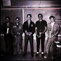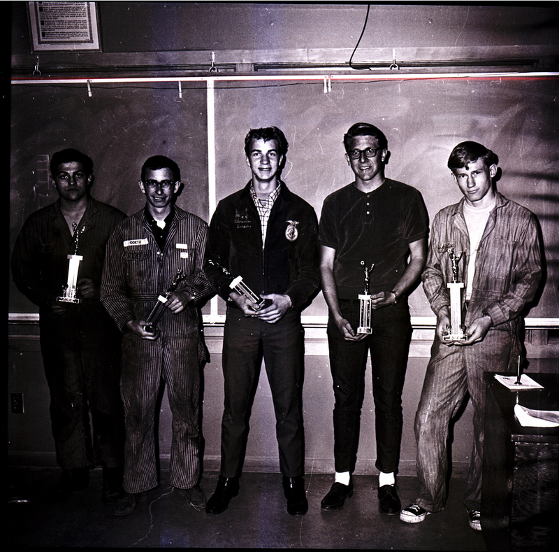 First place winners in the FFA West Magic Valley farm mechanics contest display their award trophies in a classroom. From left to right are an unknown young man, Tony Goetz, Lawrence Draper, Tom Mattix, and Kurt Jacky. Behind the boys is a blackboard, and to the side is a desk with a paperweight and a stack of papers on it.