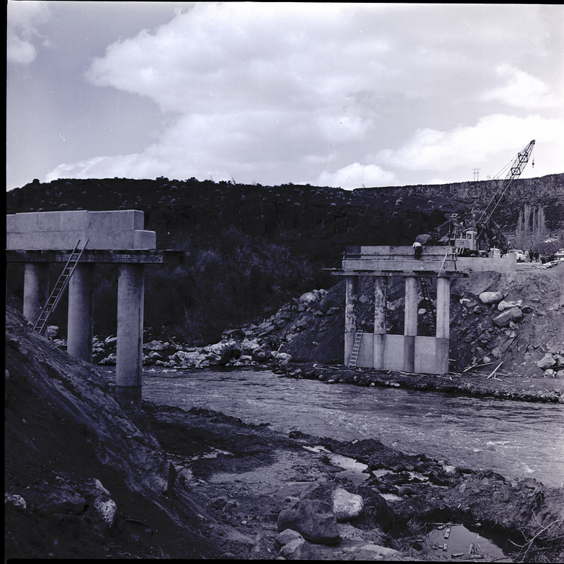 Several trucks and cranes work on the construction of the Clear Lakes Bridge. A few men are seen standing next to a truck, and one man is standing on one of the supports of the new bridge. Supports are built on either side of the Snake River, and small trees and rocks line the river bank. In the background is the walls of the Snake River Canyon.