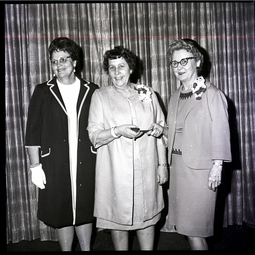 Members of the fourth district Idaho Federated Women's Clubs gather at a meeting. The woman on the right is wearing a dress and gloves. The center woman and the woman on the left are wearing dress suits with corsages pinned to the lapels, and the woman on the left hands the center woman a gavel.