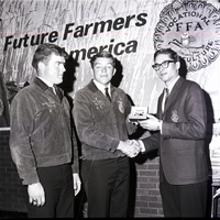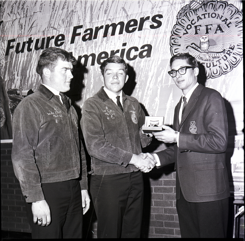 A man dressed in a suit and tie hands an award watch to Rex Butler during the Twin Falls chapter FFA Parent-Son Banquet. Member Mike O'Dell watches. The boys are wearing their FFA jackets. Hanging on the all behind them is a banner reading "Future Farmers of America Vocational FFA Agriculture."