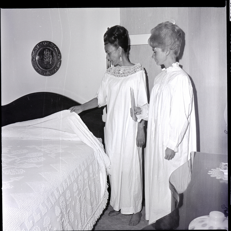 Two women model nightgowns for the upcoming Twin Falls Rotary Club anniversary dinner-dance held at the Blue Lakes Country Club. One woman pulls back the white bedspread of a bed, while the other stands beside her holding a tall candle. A decorative plate hangs on the wall above the headboard of the bed. On the right side of the room is a dresser.