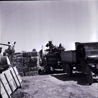 Ed Vogel visits with another farmer in front of an eight-ton steam engine used to run a hay chopper. The word "Peerless" is written across the back of the steam engine. A stack of hay bales is piled to the side, and two farmers stand on top of the pile, moving the hay bales. A truck is parked behind the steam engine.