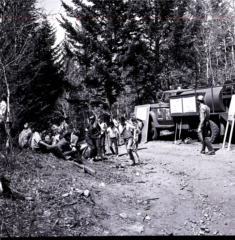 Several Minidoka and Cassia County sixth graders collect branches to learn about fire control on a conservation tour of Howell Canyon. Other child sit on the ground of a slope, watching. To the right of the group of children is a truck, and a forest ranger wearing a hard hat walks beside it. Several posters are taped to the side of the truck, and some posters are mounted on boards or easels beside the truck. A shovel, hoe, and chainsaw sit on the ground under the truck. Tall pine trees cover the area.
