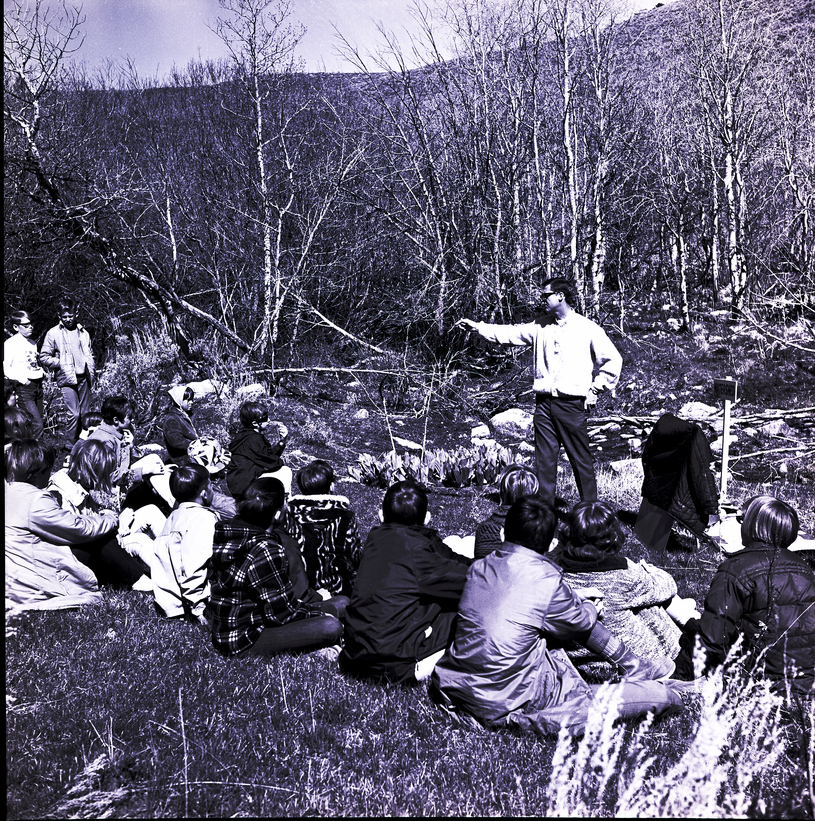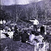 A man speaks to a group of Minidoka and Cassia County sixth graders about watershed on a conservation tour of Howell Canyon. The children sit on the ground listening to the man. In front of the group is a sign reading "Watershed." Rocks, wild grass, and trees cover the area.
