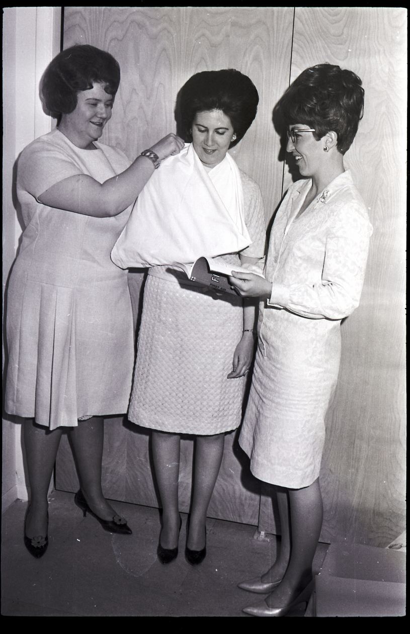 - A woman helps put another woman's arm in a sling during a first aid workshop held as part of the activities of the Alpha Nu Chapter's Epsilon Sigma Alpha Founder's Day celebration. A third woman watches, holding a book that says "First Aid" on the cover and spine.