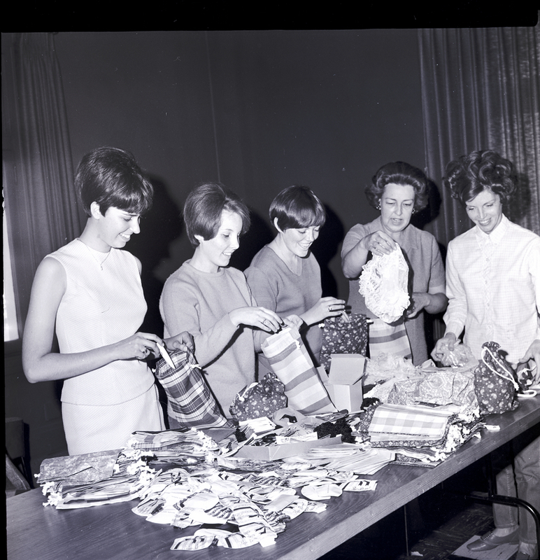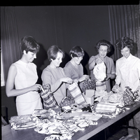 Preparing tote bags for the International Order of Job's Daughters Grand Council are, from left to right, Kathy Griffith, Vicki Knight, and Linda Sonius, honored queens of the three local bethels, Mrs. Marian Jenkins, and Mrs. Don Sonius. Members of the three bethels in Twin Falls, No. 43, 19, and 56, are making the tote bags and acquiring items to fill them for each girl in attendance at the Grand Council. A variety of materials, many of which were donated by merchants in the Magic Valley, are spread out on a table.