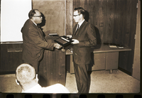 KEL 988 001 Accepting an USDA Group Superior Service Award from Dr. C. H. Wadleigh, left, director of the Soil and Water Conservation Research Division, Agricultural Research Service, is Dr. Marvin Jensen, acting director of the Snake River Conservation Research Center at Kimberly. Dr. Jensen accepted the plaque on behalf of the research center and staff. Mr. Jensen is dressed in a suit and tie, and Mr. Wadleigh is dressed in a suit and bow tie. The two men are shaking hands. In the room behind them is a podium and a long metal desk. Another man watches in the foreground. -