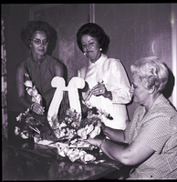 KEL 987 Announcing plans for the Twin Falls Music Club's annual Garden Membership Tea to be held at the Twin Falls YM-YWCA and hosted by the unit's past presidents are, from left to right, Mrs. Don Heller, treasurer of the past president's group; Mrs. Clayta Christensen, decorations chairman; and Mrs. John Birrell, president of the past president's group. The members work on a centerpiece for the event that features a small lyre sculpture surrounded by an arrangement of flowers.