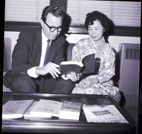 KEL 586 Keith Natelle, O'Leary Vice Principal and Dean of Boys, visits with Mrs. Sumiko Kodama, an English teacher visiting from Tokyo, Japan under the International Teacher Development program of the U.S. Department of Health Education and Wellfare. Mr. Natelle is dressed in a suit and tie and Mrs. Kodama is dressed in a kimono. They are seated on a couch looking at an English grammar book, and several other texts on the English language are laying on the coffee table in front of them.
