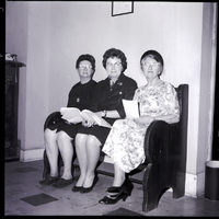 KEL 583 Red Cross officials make tentative plans for a six hour course for nurses in natural disaster training. Seated from left to right are Mrs. Mary Bolton, Red Cross nurse recruiting chairman, Zara Lund, Red Cross regional nursing representative, and Mrs A. L. Wirsching, Red Cross nursing chairman. They are wearing dresses, and Mrs. Wirsching is wearing a hat. Mrs. Lund is holding a booklet of papers on her lap, and Mrs. Wirsching is holding a pamphlet. They are seated on a bench, and a framed certificate hangs on the wall above them.