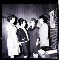 KEL 591 Extension Homemakers Council officers gather at a meeting held at the Rogerson Hotel in Twin Falls. They are wearing dresses and two of the women are wearing hats. A table and chair is against the side wall, and an artwork print hangs on the wall.