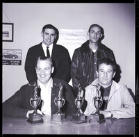 KEL 590 FFA contest winners at the west Magic Valley District FFA Contest held in Gooding display their award trophies. From left to right are Twin Falls FFA members David Sommer, David Coffelt, Michael O'Dell, and Donald Montgomery. They are dressed in suits and ties and their embroidered FFA jackets. In the classroom behind them is a projector drape and a blackboard.