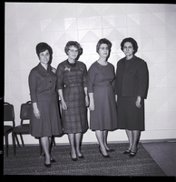 KEL 592 Officers meeting of the Extension Homemakers Councils and Extension Home Economics Agents was held in the Rogerson Hotel in Twin Falls. From left to right are Mrs. Ben Eldredge, president of the Twin Falls County Extension Homemakers Council, Mrs. H. V. Beaver, district director, Mildred Haberly, state home economics leader at Idaho State University, and Agnes Hurst, Twin Falls County extension home economics agent. They are all wearing dresses. Behind them are a few chairs.