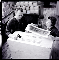 KEL 557 "From Herrett's Stock Twin Falls, Idaho, To Transportation Officer, Rock Island Army Depot, Rock Island, Illinois" is painted on a crate of precision-made wooden stocks manufactured by Steven J. Herrett. Holding the stencil is Marcia Hiatt, supervisor of inspection, and applying paint is Leonard Parkin. This is the last of a shipment of 10,000 flawless pairs of wooden pistol grips to be shipped to the U.S. Army Ordnance Department, for which Herrett is a prime contractor. The counter tops behind them are covered in boxes.